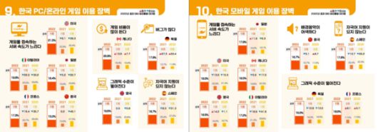 이밖에도 한국 게임 이용장벽은 PC와 모바일 게임 모두 같은 이유를 꼽았다. PC 게임 이용장벽은 '게임을 접속하는 서버 속도가 느리다(18.4%)', '높은 사양의 디바이스가 필요하다(17.8%)' 순으로 나타났다. 모바일 게임 이용장벽도 '게임을 접속하는 서버 속도가 느리다(17.9%)'에 이어 '높은 사양의 디바이스가 필요하다(16.3%)' 순으로 나타났다.