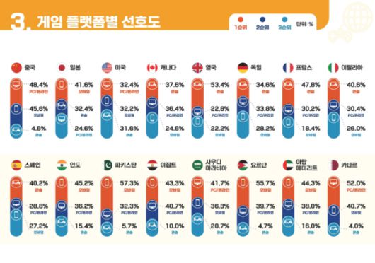 한국과 가까운 중국은 PC, 일본은 모바일 플랫폼을 가장 선호하는 것으로 나타났다. 다만 중국의 경우 PC와 모바일 선호도가 크게 차이 나지 않았고, 일본 설문응답자 중 3분의 1은 콘솔을 택했다.