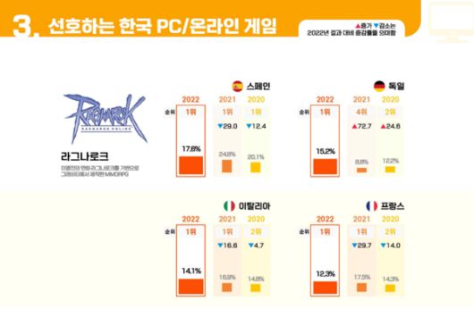 해외에서 가장 인기 있는 한국 게임에는 다양한 게임사의 작품이 이름을 올렸다. 먼저 PC 게임은 그라비티의 '라그나로크'가 스페인 독일 이탈리아 프랑스 등에서 가상 선호하는 게임으로 뽑혔다. 9개국 중 4개국의 선택을 받은 것이다. 지난 2002년 공식 출시돼 올해 20주년을 맞은 게임이 아직도 글로벌 시장에서 강세를 보이고 있다.