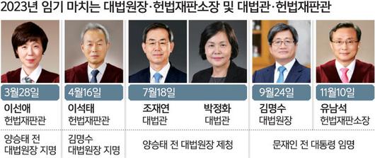 2023년 올해 사법부 지형에 큰 변화가 예상된다. 문재인 전 대통령이 임명한 대법원과 헌법재판소 수장이 모두 교체되고, 대법관과 헌법재판관도 각 2명씩 임기를 마치고 교체된다. 법조계에서는 인적 구성에 보수 경향이 짙어지고, 김명수 대법원장이 추진해온 사법개혁 일부에 제동이 걸릴 것으로 관측하고 있다.
