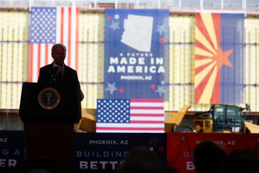 조 바이든 미국 대통령이 지난 6일(현지 시각) TSMC의 애리조나 반도체 공장 건설 현장을 찾아 연설하고 있다. /로이터 연합뉴스 |