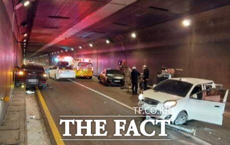 [더팩트ㅣ부산=조탁만 기자] 1일 오후 10시 30분쯤 부산 동래구 만덕2터널(미남로터리→만덕 방향)에서 20대 A씨가 몰던 K7 차량이 40대 B 씨의 모닝 차량을 부딪히고 그 충격으로 20대 C 씨의 벨로스터 차량을 연이어 들이받았다.
