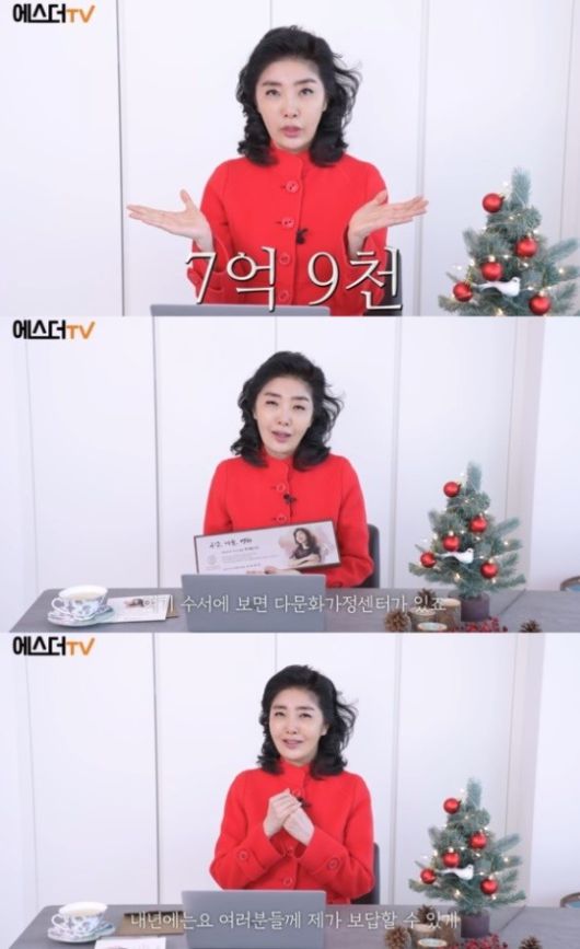 또한 여에스더는 "(2022년)12월 28일 이 시간에 방금 5000만원 기부했다. 우리가 하는 기부가 제대로 되어 있는지를 모니터링 할 수 있는 정책과 관련된 것에(했다). 올해도 정말 의미있는 기부 7억 9천만원을 했다. 천만원만 더 했으면 8억인데 좀 아쉽다. 그래도 저희가 마음을 다해서 한 기부니까 괜찮다"고 말했다.