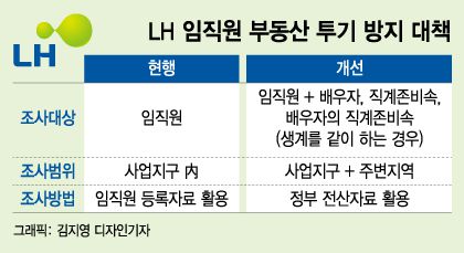 우선 LH 임직원의 부동산 거래 조사를 강화한다. 기존 LH 직원에 한정했던 거래 조사 대상을 직원 가족으로 확대한다. 대상은 배우자, 직계존비속, 배우자의 직계존비속까지다. 조사 범위는 사업지구 내 토지에서 인근지역까지 확장한다.