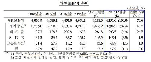 한국은행은 지난해 12월 말 기준 우리나라의 외환보유액은 4천231억6천만달러로, 전달 말(4천161억달러) 대비 70억6천만달러 증가했다고 4일 밝혔다.