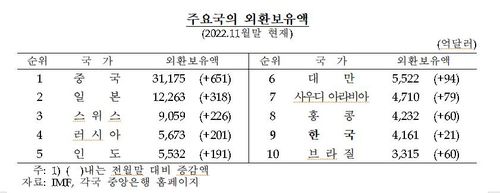 중국이 3조1천175억달러로 가장 많았고, 일본(1조2천263억달러)과 스위스(9천59억달러), 러시아(5천673억달러), 인도(5천532억달러), 대만(5천522억달러), 사우디아라비아(4천710억달러), 홍콩(4천2천32억달러) 등이 우리나라보다 많았다.
