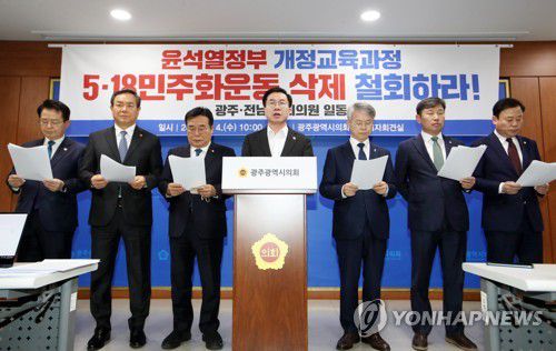 광주·전남 국회의원들은 4일 광주시의회에서 기자회견을 열어 "민주주의 발전과 계승을 위해 개정 교육과정에서 '5·18 민주화운동' 삭제를 철회하라"고 촉구했다.