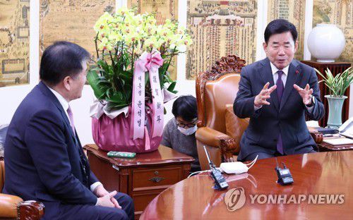 한편, 김 의장은 신년 인사차 난을 가져온 이 수석에게 "계묘년 토끼해에 정무수석을 통해 좋은 난을 보내주셔서 새해에는 국회와 대통령의 관계가 훨씬 원활하게 소통되겠구나 하는 생각을 국민들께 드릴 수 있겠다"며 "토끼는 귀가 큰 동물이니, 정부도 정치권도 국민 목소리를 잘 듣도록 노력해야 한다"고 덕담했다.