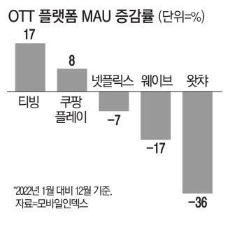 4일 빅데이터 플랫폼 기업 아이지에이웍스의 모바일인덱스에 따르면 티빙의 지난해 12월 월간 활성 이용자 수(MAU)는 489만7851명으로 같은 해 1월(418만8071명) 대비 17% 증가했다. 같은 기간 경쟁 플랫폼인 넷플릭스는 -7.0%(1241만2118명→1160만2073명), 웨이브는 -17.0%(492만931명→408만2493명)로 감소세가 두드러졌다. 티빙은 한 해 동안 신규 설치 건수도 유일하게 증가세를 보였다. 모바일인덱스에 따르면 지난해 12월 티빙의 설치 건수는 61만2404건으로 연초(48만2098건) 대비 27% 늘었다. 같은 기간 넷플릭스는 37%(55만9586건→35만2400건), 웨이브는 42%(29만2682건→17만879건) 하락했다. 이 같은 티빙의 약진에는 국내외 사업자와의 적극적인 '합종연횡'이 주효했던 것으로 풀이된다. 티빙은 지난해 6월 세계적인 엔터테인먼트사 파라마운트+와 손잡고 '파라마운트+브랜드관'을 선보였다. 지난해 12월에는 KT의 '시즌'을 흡수 합병하기도 했다. 티빙에 따르면 지난해 6월과 12월 티빙의 MAU는 전월 대비 각각 33%, 101% 늘었다. 티빙은 스마트TV에서도 보폭을 넓혀가고 있다. 티빙은 2021년 말 안드로이드 TV 앱을 출시한 데 이어 지난해 4월에는 애플 TV 앱을 출시하며 앱스토어에서 TV 앱 부문 1위를 기록했다.