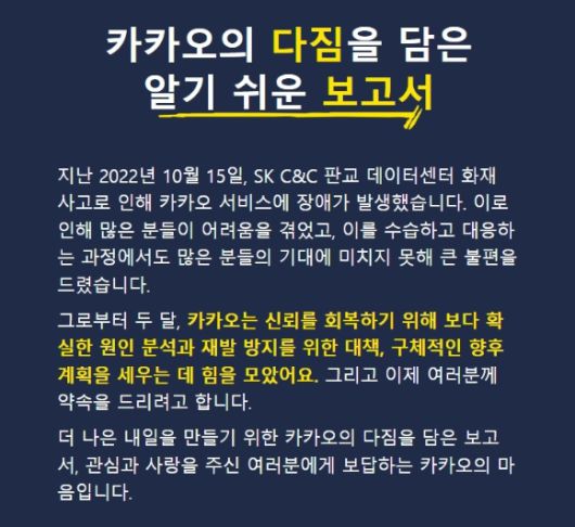카카오는 인프라 전문 조직 재정비와 자체 데이터센터 보완 등의 재발 방지 대책을 강조하며 "다시는 모두의 대화가 멈추는 일이 없도록 하겠다"고 덧붙였다.