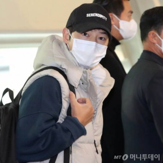 이날 송중기는 블루 컬러의 트레이닝복과 화이트 컬러의 패딩 조끼를 매치한 패션을 선보였다. 그는 비행기 탑승 전 자신을 기다리고 있던 많은 취재진에게 눈웃음을 지으며 가벼운 손 인사를 전했다.