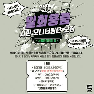 서울환경연합이 9일까지 일회용품 시민 모니터링단을 모집한다. 법적으로 금지된 일회용품 사용을 조사하며, 모니터링 결과는 지자체에 시정 요청 및 언론 보도에 활용될 예정이다. 서울환경연합 누리집(seoulkfem.or.kr)에서 신청하면 된다.