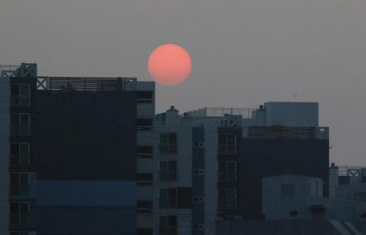 미세먼지가 온종일 나쁨 상태인 5일 오후 광주 도심에서 바라본 태양이 미세먼지와 구름에 가려 달처럼 아파트 단지 사이로 떠올라 있다. 광주=연합뉴스 |
