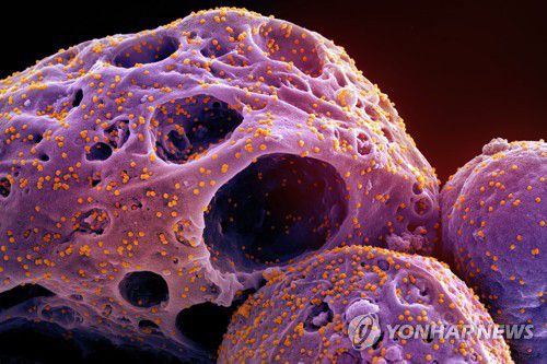 코로나19 오미크론 변이(노란색 알갱이)에 감염된 세포 현미경 사진 |