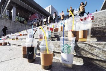 녹색연합, 여성환경연대, 환경운동연합, 이제석광고연구소 관계자들이 2일 오전 서울 종로구 세종문화회관 계단에서 일회용컵 보증금제의 전국 시행을 촉구하는 퍼포먼스를 하고 있다. [연합] |
