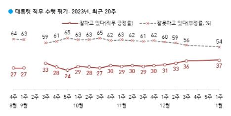 한국갤럽은 지난 3일부터 5일까지 전국 만 18세 이상 1002명을 대상으로 조사한 결과 윤 대통령의 직무 수행 평가에서 ‘잘하고 있다’고 응답한 비율은 37%를 기록했다. 지난 조사(12월 3주)와 비교해 1%포인트 상승했다. 지난 11월 4주차 조사부터 5주 연속으로 상승세를 유지하고 있다.
