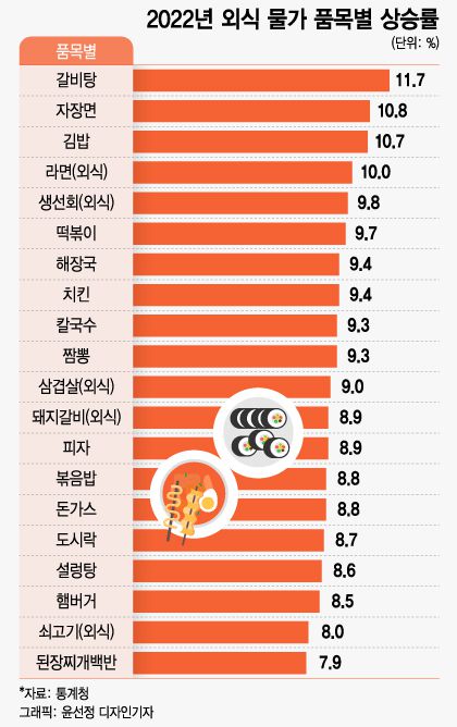 6일 통계청에 따르면 지난해 외식물가 상승률(전년 대비)은 7.7%로 1992년(10.3%) 이후 30년 만에 가장 높았다. 외식물가를 구성하는 39개 품목 가격은 일제히 뛰었다. 품목별로 보면 갈비탕 11.7%, 자장면 10.8%, 김밥 10.7%, 라면 10.0%, 떡볶이 9.7%, 치킨 9.4% 등 순으로 가격 상승률이 높았다. 지난해 전체 소비자물가 상승률은 전년 대비 5.1%로 외환위기 때인 1998년(7.5%) 이후 가장 높았다. 이 가운데 외식물가 등 개인서비스 가격 상승분이 차지한 정도는 약 30%(1.67%포인트)에 달한다.
