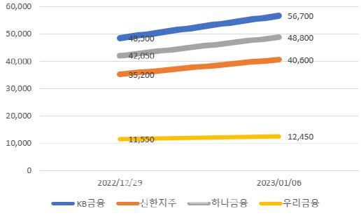 7일 한국거래소에 따르면, KB금융은 지난 6일 5만6700원에 장을 마쳐 지난해 연말(29일)대비 16.9% 급등했다. 같은기간 신한지주와 하나금융지주 역시 15.3%와 16.1%씩 큰 폭으로 올랐다. 우리금융지주도 7.8% 상승했다. KRX은행지수도 동기간 11.16% 뛰어 지수중 가장 상승률이 높았다.