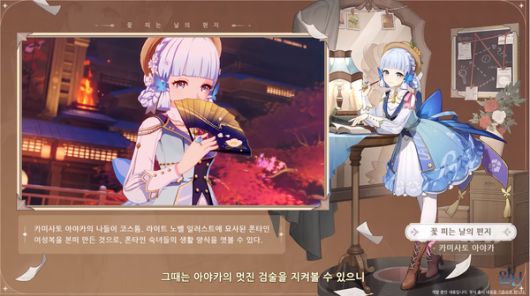 특히 연무의 시범 경기에서는 '카미사토 아야카'가 새로운 의상 '꽃 피는 날의 편지'를 입은 모습을 볼 수도 있다. 새 코스튬은 라이트 노벨 일러스트에 묘사된 폰타인 여성복을 본떠 만든 것으로 3.4버전 업데이트와 함께 상점에 출시된다.