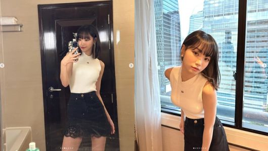 민소매 티에 짧은 검정 스커트를 입고 옷맵시를 뽐내고 있는 가운데, 그의 한줌 허리가 시선을 사로잡는다.