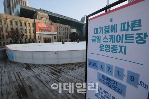 고농도 미세먼지로 인해 서울광장 스케이트장이 중단된 8일 오전 서울광장에 ‘대기질에 따른 금일 스케이트장 운영중지’ 안내문이 붙어 있다.[이데일리 이영훈 기자] |