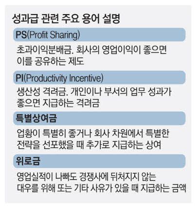 ▷일반적으로 PS(Profit Sharing)는 초과이익분배금을 지칭한다. 회사가 영업이익을 크게 냈으니 이를 직원과 공유한다는 개념이다. PI(Productivity Incentive)는 생산성 격려금으로 성과가 좋은 직원이나 부서에 지급하는 성과급이다.