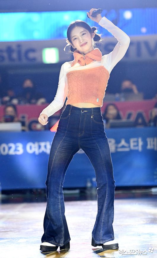 (엑스포츠뉴스 인천, 김한준 기자) 8일 오후 인천광역시 중구 도원체육관에서 열린 '신한은행 SOL 2022-2023 여자프로농구 올스타 페스티벌' 핑크스타와 블루스타의 경기, 걸그룹 오마이걸 아린이 멋진 공연을 선보이고 있다.김한준 기자 kowel@xportsnews.com