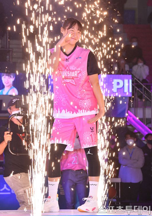 [인천=스포츠투데이 팽현준 기자] 8일 인천 도원체육관에서 열린 2022-2023 여자프로농구 올스타 페스티벌, 하나원큐 정예림이 팬들 앞에서 춤을 추며 인사하고 있다. 2023.01.08. [스포츠투데이 팽현준 기자 sports@stoo.com]