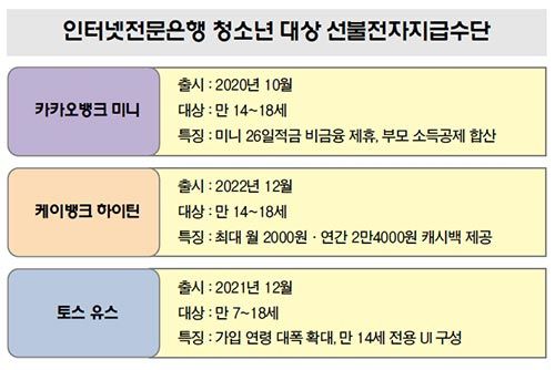 현재 카카오뱅크가 ‘미니(mini)’로 10대 고객을 빠르게 흡수한 가운데 케이뱅크는 ‘하이틴(Hi teen)’을 출시하며 청소년층 대상 서비스 경쟁에 합류했다. 토스뱅크의 모회사 토스는 만 7세도 이용할 수 있는 ‘유스(Youth)’로 이용 연령을 대폭 확대했다.