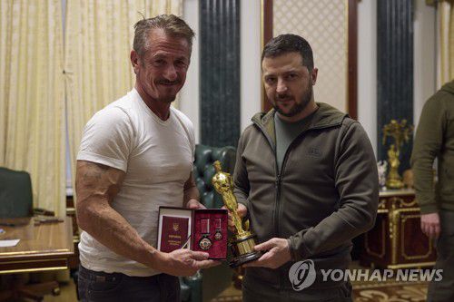 작년 11월 젤렌스키 우크라이나 대통령을 만나 자신의 오스카 트로피를 전달하는 할리우드 배우 숀 펜 |