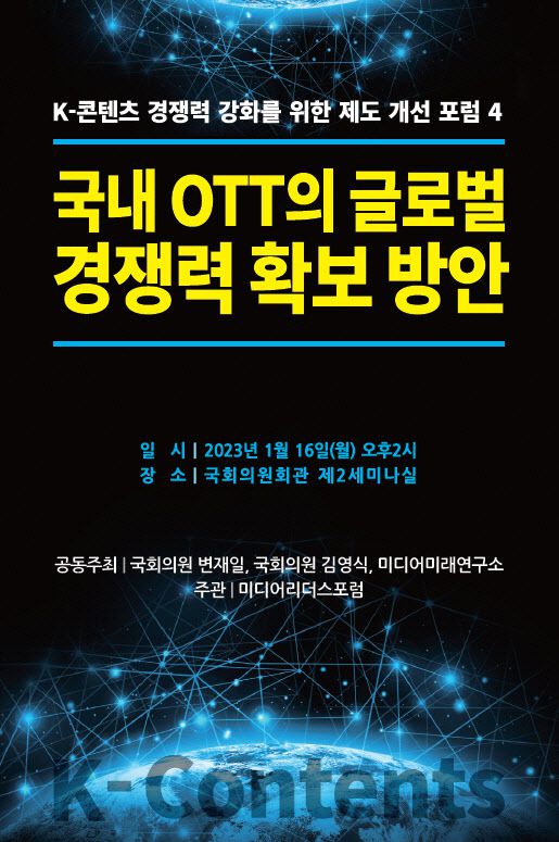 변재일 의원(더불어민주당, 청주시청원구), 김영식 의원(국민의힘, 경북 구미시을), 미디어미래연구소(소장 김국진)가 오는 16일(월) 오후 2시부터 국회의원회관 제2세미나실에서 ‘국내 OTT의 글로벌 경쟁력 확보방안’을 주제로 ‘K-콘텐츠 경쟁력 강화를 위한 제도개선 포럼4’을 개최한다.