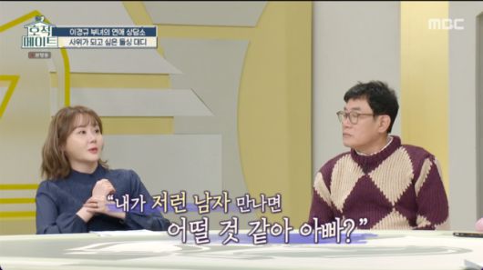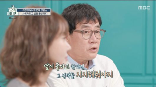 이경규는 “내가 봤을 대 바로 허락은 안 해줄거다. 과거보다는 미래에 어떻게 살건지를 더 생각하게 된다. 감성으로 다가가지 말고 이성적으로 다가가서 하나씩 하나씩 풀어가야 한다”라고 현실적인 조언을 더했다. 이경규는 “내가 아버지 된 입장이라면 나는 별로 개의치 않을 거다. 딸이 좋다고 한다면 자기 인생이니까. 알아서 해라”라고 전했다.