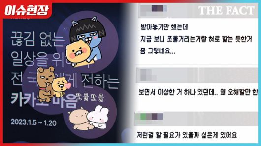 무료로 배포된 이모티콘은 춘식이, 토심이와 토뭉이, 망그러진 곰 3종으로 귀여운 캐릭터들로 꾸며져 있지만 몇몇 이모티콘의 행동이 성적 행위를 연상케하는 모습을 보여 민망하다는 의견들이 '맘카페'를 중심으로 제기되고 있습니다.