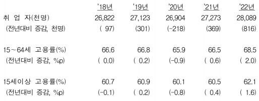 공미숙 통계청 사회통계국장은 "2022년은 일상 회복에 따른 활동 증가, 수출, 돌봄 수요로 견조한 취업자 증가세가 나타났다"며 "다만 대내외 경제 상황이나 기저효과로 인해 하반기에는 취업자 증가세가 둔화하는 모습을 이어갔다"고 분석했다.