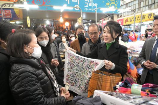 또 동절기용 개량 한복을 살펴보며 “(윤석열) 대통령이 (사이즈가) 너무 크셔서”라고 웃으며 말했다. 또 한 침구 가게에서 노란색 담요를 보며 “저희 남편이 이런 것을 좋아해요”라고 했다.