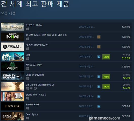 ▲ 1월 11일 오후 12시 기준 스팀 전세계 최고 판매 제품 TOP10 (자료출처: 스팀) |
