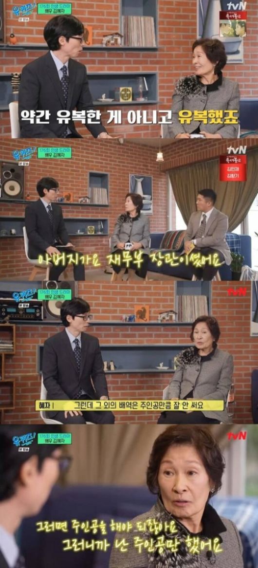 아버지에 대한 언급도 했다. 어릴 때 유복했다는 김혜자 씨는 "아버지가 재무부 장관이었다. 우리나라 두 번째 경제학 박사다. 집이 굉장히 컸다. 우리 집이 공원인 줄 알고 사람들이 들어오고 그랬다. 거실이 200평, 대지가 900평이었다"라고 말해 모두를 놀라게 했다.