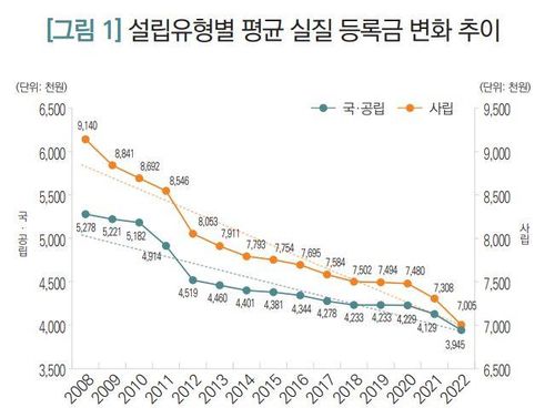 이에 비해 소비자물가 상승률을 고려한 2022년 실질등록금은 632만6천원으로 2008년 대비 23.2% 낮은 수준이라고 연구진은 분석했다.