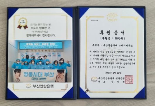 부산영웅시대 '스터디하우스'는 "앞으로도 독거노인들을 위해 지속적으로 후원과 봉사를 하겠다"고 전했다.
