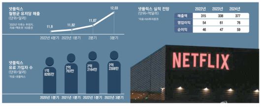NH투자증권에 따르면 올해 넷플릭스의 매출액, 영업이익은 각각 338억달러, 61억달러로 추정된다. 각각 전년 대비 7.3%, 13% 증가한 수치다. 순이익 또한 지난해(46억달러)보다 소폭 증가한 47억달러로 전망되고 있다. 넷플릭스는 2024년에도 이익 성장을 지속할 것으로 추정되고 있다.
