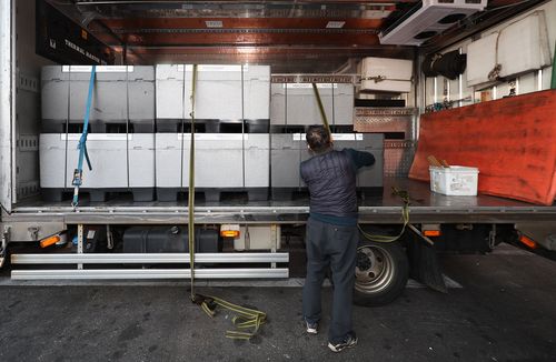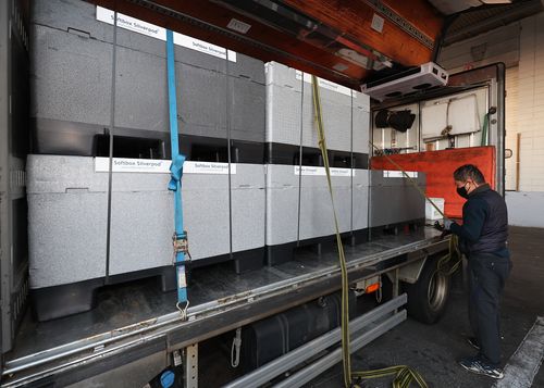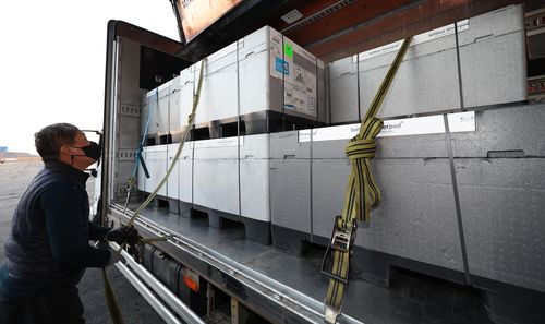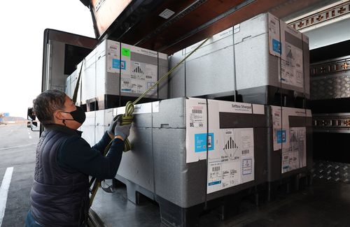 (영종도=연합뉴스) 김도훈 기자 = 12일 인천국제공항 화물터미널에서 관계자가 이날 처음 들어온 영유아용 화이자 코로나19 백신을 수송 차량에 싣고 있다.