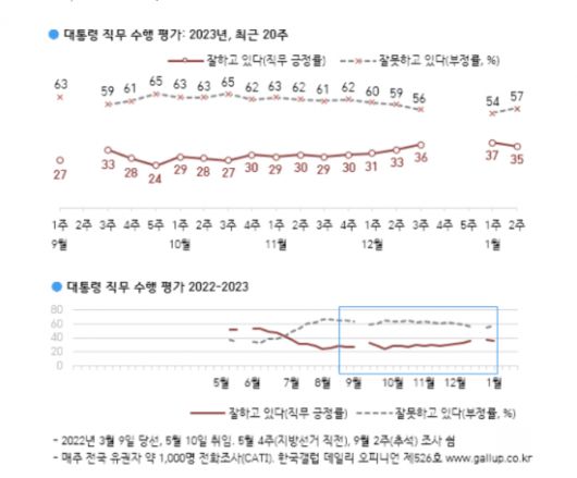 12일 여론조사기관 갤럽이 공개한 자체 정례 여론조사(10일~15일 전국 만 18세 이상 성인남녀 1002명을 대상으로 전화 조사원 인터뷰 방식으로 진행)에 따르면 윤 대통령이 지지율은 지난주 조사보다 2%포인트 하락한 35%를 기록했다. 지난해 11월3주 이래로 이어졌던 윤 대통령의 지지율 상승세는 이로써 꺾였다. 잘못하고 있다는 부정평가는 지난주 조사보다 3%포인트 오른 57%로 나타났다.