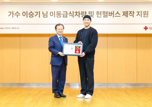 이승기는 13일(금) 재난구호 활동 지원을 위한 이동급식차량과 혈액 부족 문제 해소를 위한 헌혈버스 제작 지원금 5억 5천만 원을 대한적십자사에 전달했다.