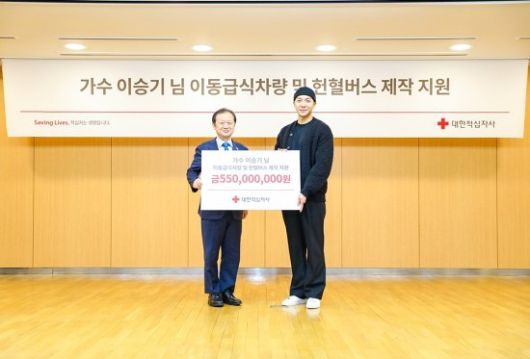 이승기는 13일 대한적십자사에 기부금 5억 5,000만 원을 전달했다. 재난구호 활동 지원을 위한 이동급식차량과 혈액 부족 문제 해소를 위한 헌혈버스 제작 지원금이다.