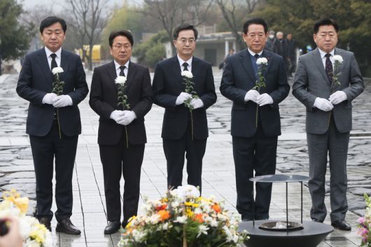 김동연 경기도지사를 비롯한 더불어민주당 광역지방자치단체장들이 설을 앞둔 14일 고 노무현 전 대통령의 묘역을 참배하고 문재인 전 대통령을 예방했다.