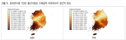 이에 따르면 조출생률의 경우 경기 북부와 서울, 호남 해안 및 내륙 일부 지역에서 1인당 출산지원금 수혜금액이 높을수록 크게 증가하는 경향을 보인 반면 강원, 충청, 경남 해안 및 내륙 일부 지역의 경우 수혜금액과 조출생률간의 연관성이 낮았다.