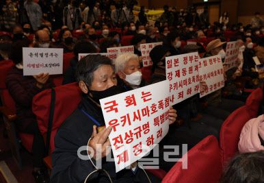 지난 12일 오전 서울 여의도 국회 의원회관에서 열린 강제징용 해법 논의를 위한 공개토론회에서 참석자들이 피켓을 들고 있다. (사진=노진환 기자) |