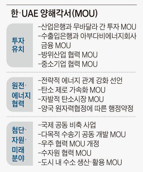 산업은행과 UAE 국부펀드 중 하나인 무바달라는 이번 투자협력을 구체화하기 위해 전략적 투자 파트너십 양해각서(MOU)를 체결했다. 이에 따라 산업은행과 무바달라는 첨단 분야를 중심으로 국내 공동 투자 기회를 모색하고 제3국 공동진출 등 투자 협력을 확대한다. 기존 원전, 에너지, 기업 투자, 방산 등 4대 핵심 협력 분야를 넘어 신산업, 첨단 인프라, 신재생에너지, 보건·의료, 식량·수자원 등 전 분야로 협력 대상을 확대한다는 것이다. 수출입은행이 중동 핵심 발주처 중 하나인 아부다비 국영에너지회사와 금융 협력을 하는 MOU도 체결해 신속한 금융 지원을 하기로 했다.