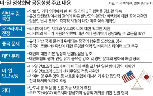 특히 바이든 대통령은 정상회담 모두발언에서 3대 안보문서 개정에 대해 “일본의 역사적인 국방지출 증액과 새로운 국가안보전략을 기반으로 우리는 군사동맹을 현대화하고 있다”고 평가했다.