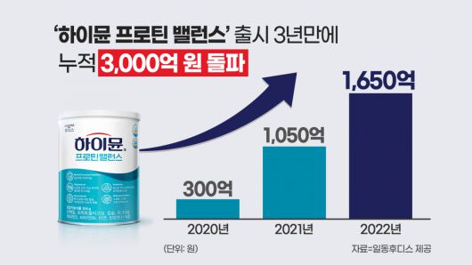 지난 2020년 2월 출시 이후 ‘하이뮨 프로틴 밸런스’는 매년 성장세를 거듭해 왔다. 출시 첫 해 매출 300억 원, 2021년은 1050억 원에서 2022년에는 1650억 원을 넘어서며 3년 간 누적 매출 3000억 원을 돌파해 국내 단백질 시장 1위를 지키고 있다.